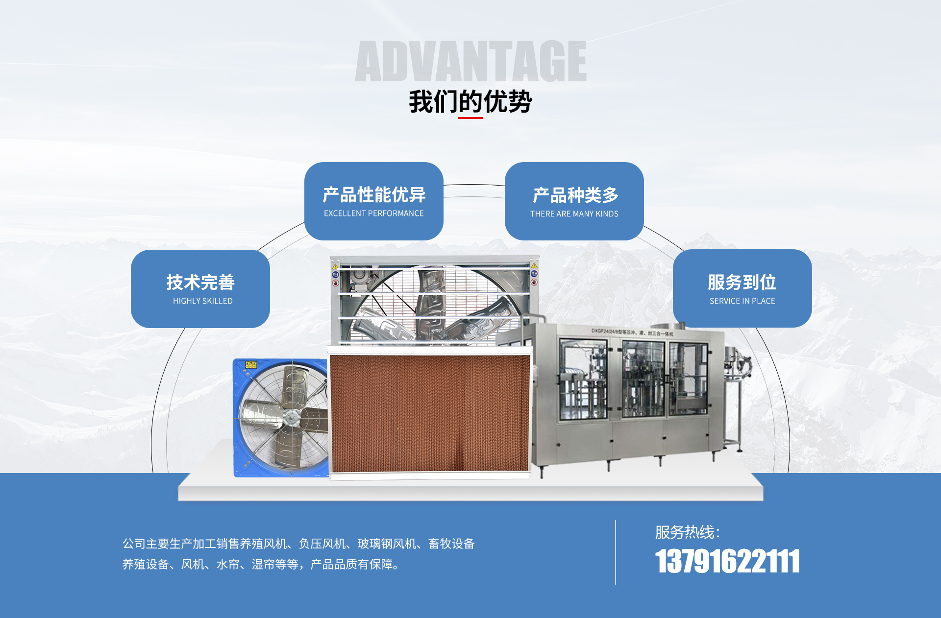 我公司建立了从产品的开发、研制、工程项目的设计、选型配套到安装调试、服务的产业体系。当下主要以生产加工销售养殖风机、负压风机、玻璃钢风机、畜牧设备、养殖设备、风机、水帘、湿帘等等,产品品质有保障。也使公司有了良好的信誉,为公司的发展打下稳固、坚实的基础。
